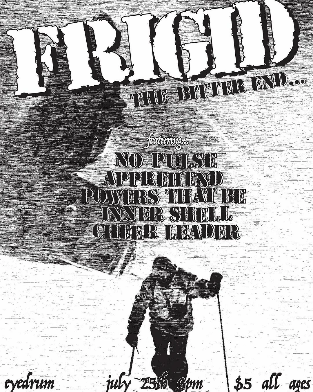 Frigid is playing their last show at eyedrum art & music gallery and were doing a Fugazi style admission price because we’re punk as fuck and only charging $5. No Pulse, Apprehend, Powers That Be, Inner Shell and Cheer Leader open.