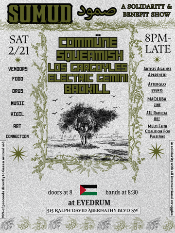 About the event: SUMUD (صمود) is a solidarity and benefit show bringing together music, art, community organizations, and connection in support of Palestine.